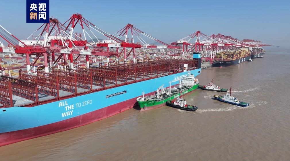 上海港完成大型集装箱船绿色甲醇“船-船”同步加注