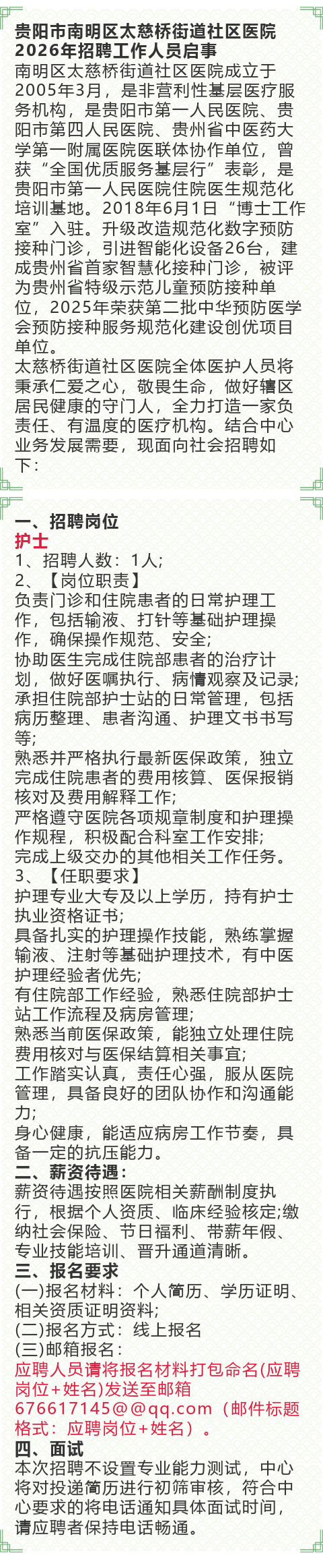 贵阳市南明区太慈桥街道社区医院招聘!大专起报!