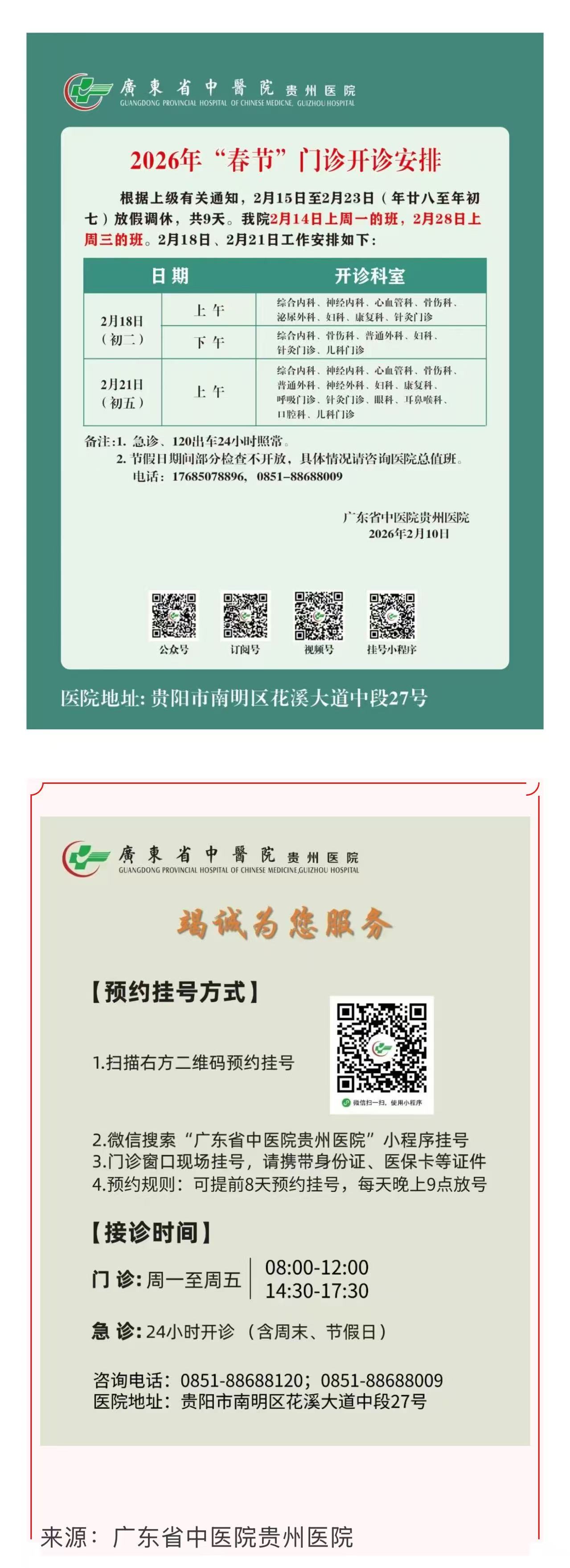 广东省中医院贵州医院2026年春节假期门急诊工作安排