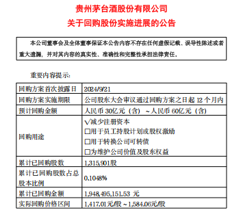 截至 2025 年 4 月 7 日,公司已累计回购股份 1,315,901 股,占公司总股本的比例为 0.1048%,购买的最高价为 1,584.06 元/股、最低价为 1,417.01元/股,已支付的总金额为 1,948,495,151.53 元(不含交易费用)。上述回购进展符合法律法规的规定及公司披露的回购股份方案。公司将按照回购金额上限,尽快完成剩余约 40.5 亿元的回购及股份注销程序。公司已着手起草新一轮回购股份方案,公司控股股东中国贵州茅台酒厂(集团)有限责任公司已着手起草增持方案,后续公司将严格按照相关规定和程序,及时披露相关公告。