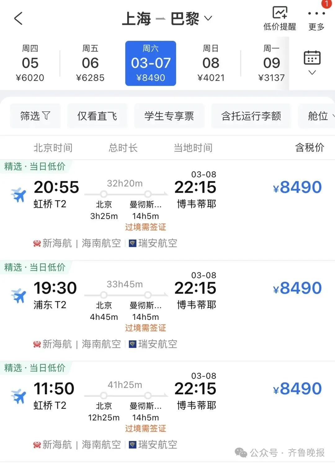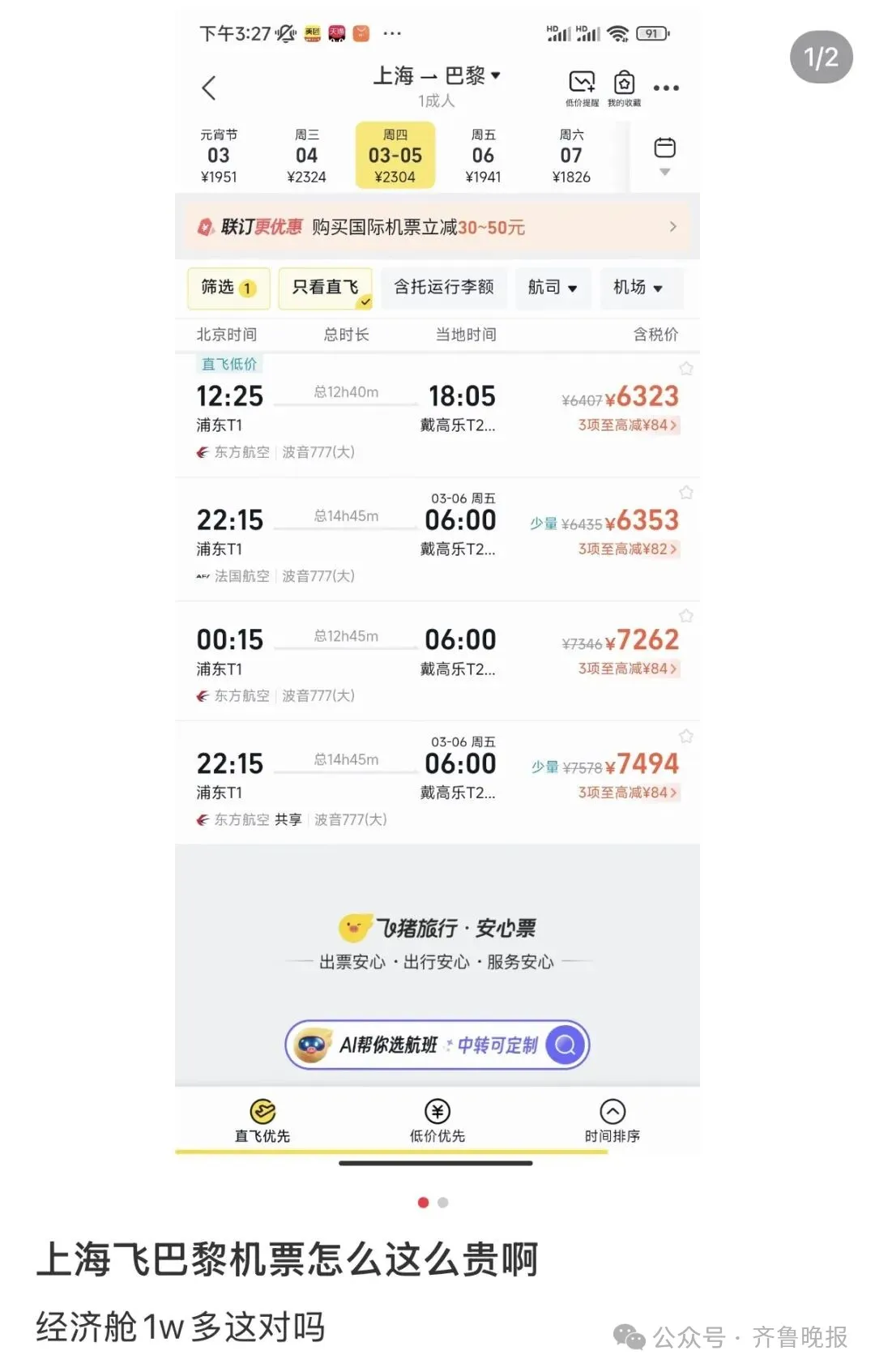 有上海网友直呼,上海飞巴黎怎么这么贵……