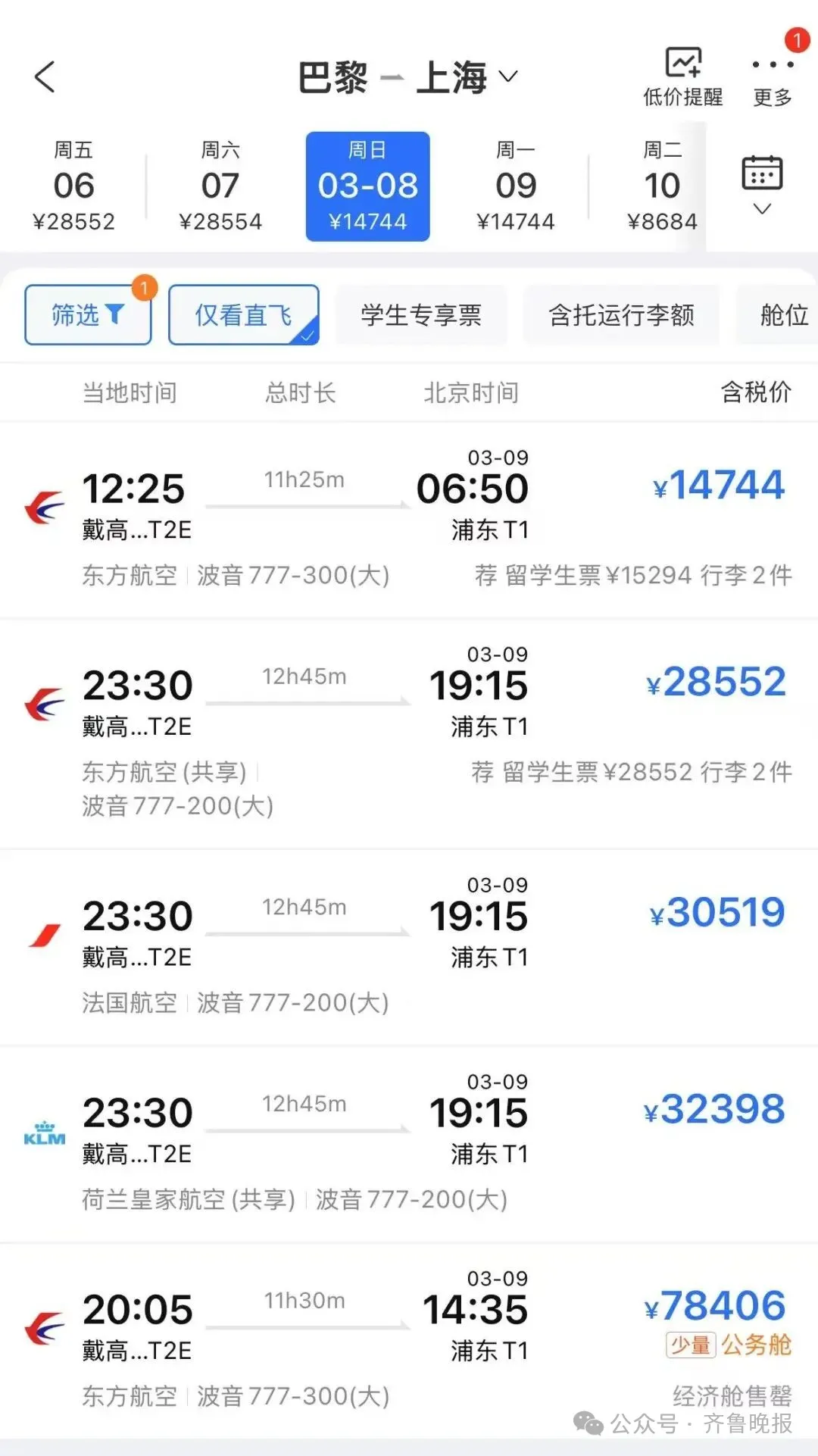而本周巴黎回上海的直飞航班机票,最便宜的经济舱也售价14744元3月5日、6日则售价超28500元。