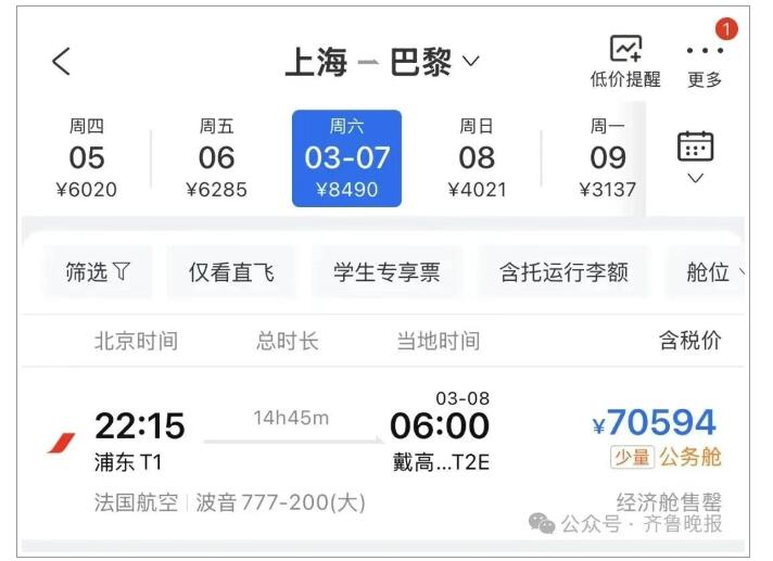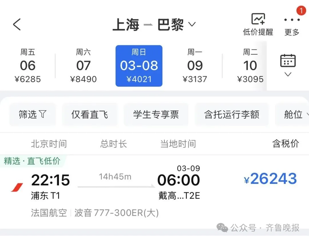 本周上海-巴黎直飞航线的经济舱仅剩3月8日,售价26243元平时5000元左右。