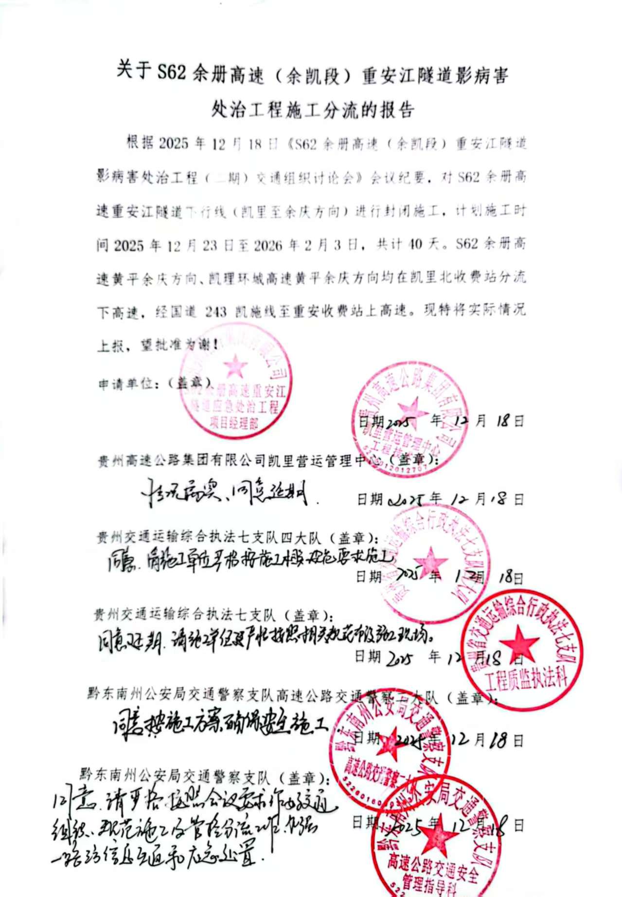 根据2025年12月18日《S62余册高速(余凯段)重安江隧道影病害处治工程(二期)交通组织讨论会》会议精神及工作安排,为保障施工顺利进行和道路交通安全,决定对S62余册高速重安江隧道下行线(凯里往余庆方向)实施封闭施工。现将施工期间交通分流事项公告如下: