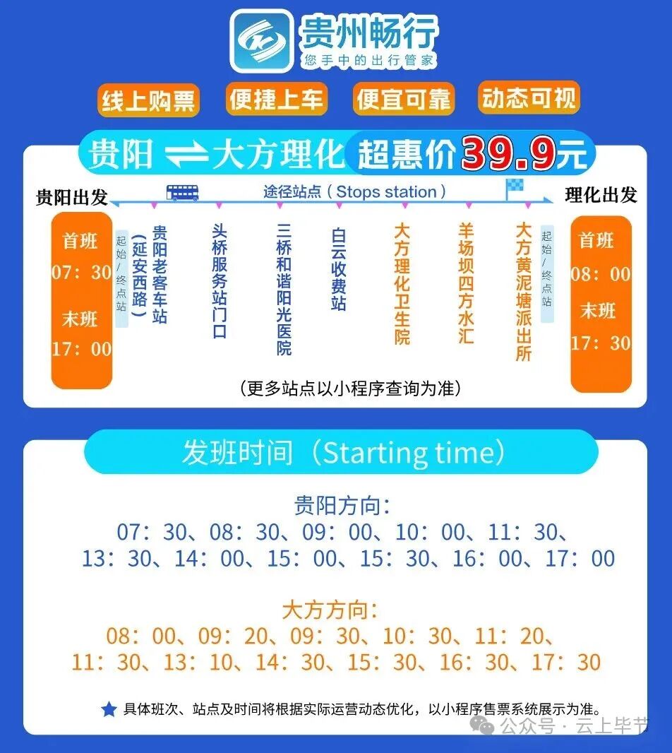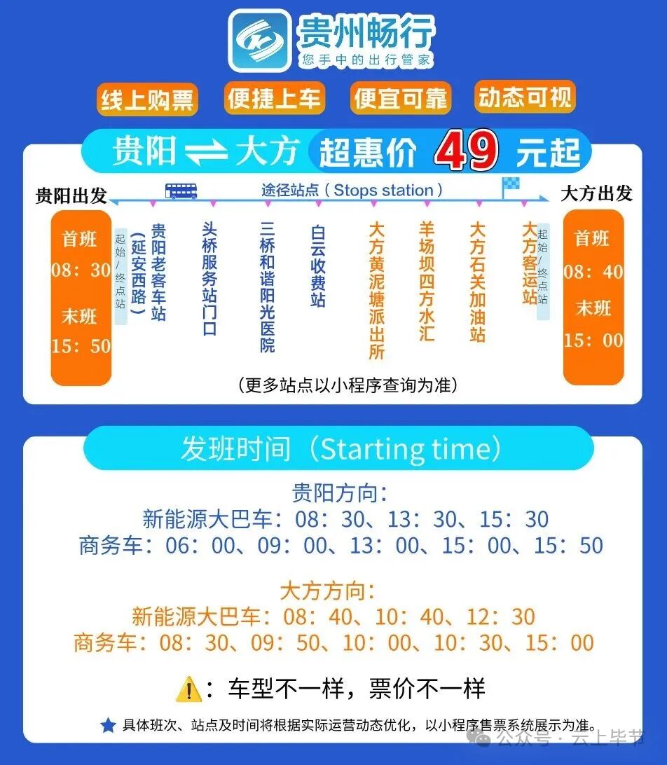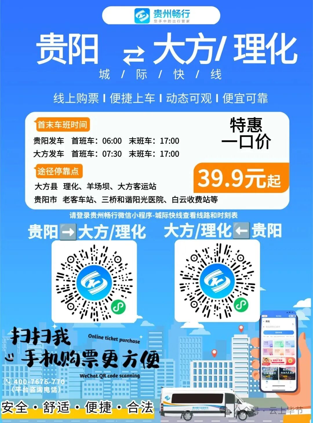 新能源大巴直达大方客运站,仅需49元,途经大方理化、大方羊场坝的班次,在此两站点上下车,可享统一优惠价39.9元。