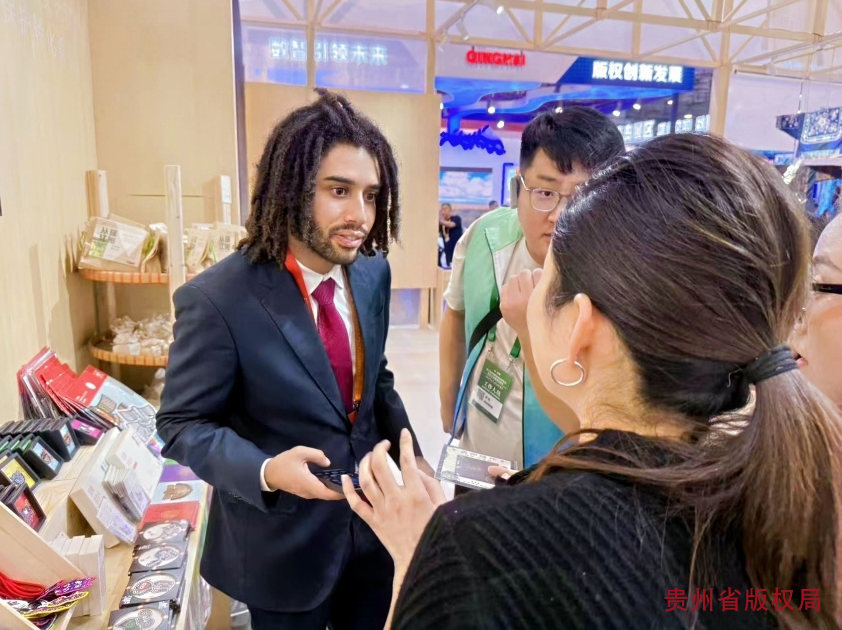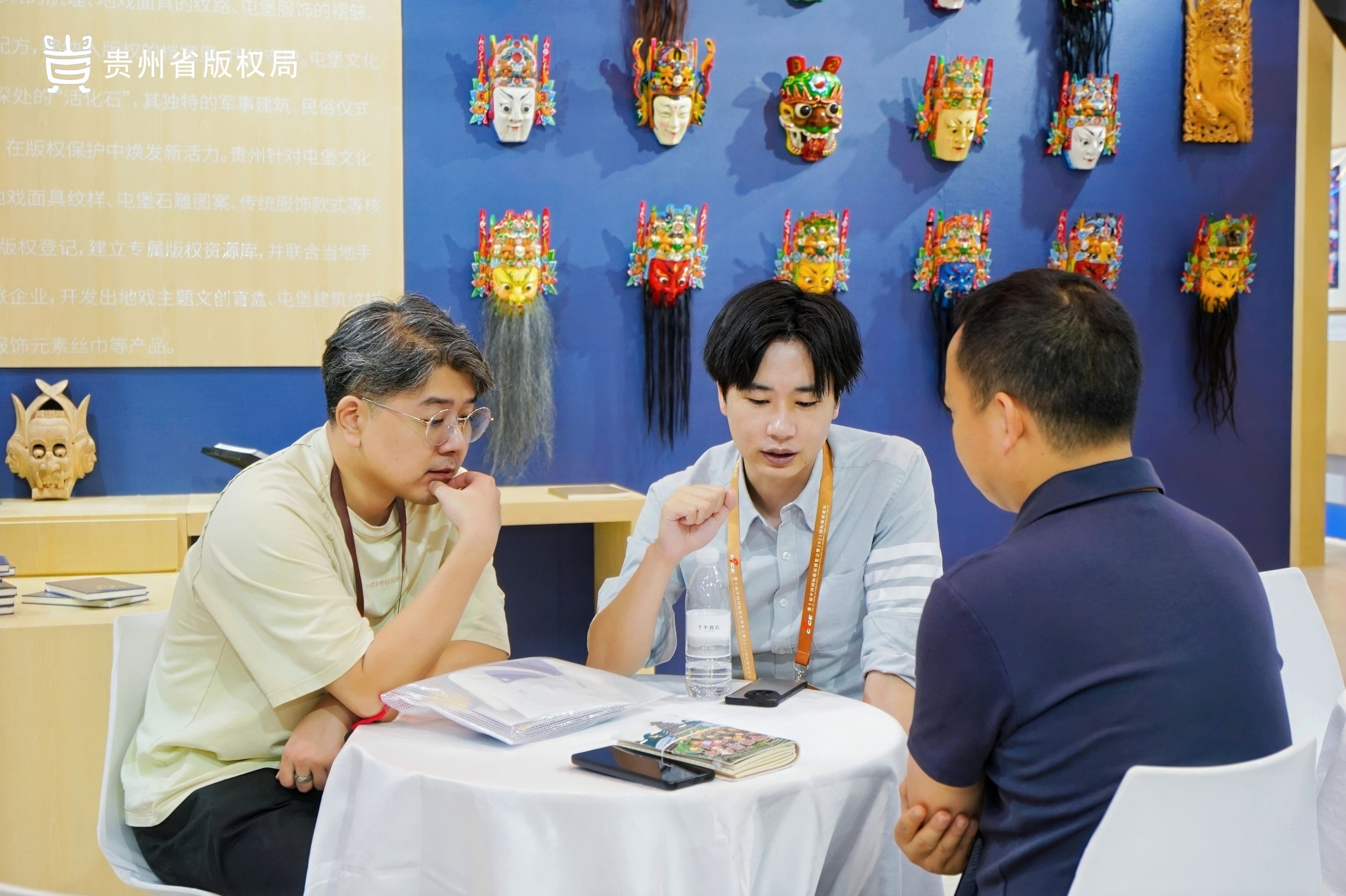 展区现场,版权服务的国际化也成为亮点。贵州与法信公证云(厦门)科技有限公司、瑞科(潍坊)文化科技达成合作意向,推动版权跨境存证与授权;与浙江省苍南县徽章厂探讨文创衍生品规模化生产,让“贵州设计”对接“中国制造”。