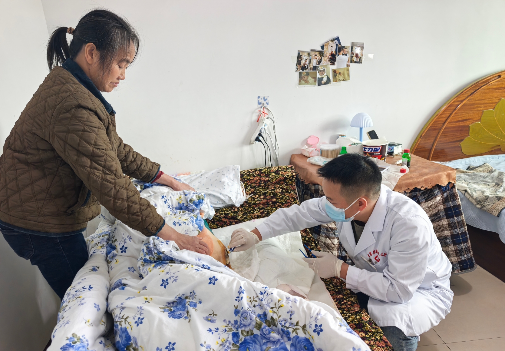 在文家店镇安江社区,家医团队发现一位重度失能且患有帕金森综合征的老人存在严重褥疮与感染风险,立即进行清创换药,并为其家属提供饮食营养与护理技巧指导,镇卫生院医生后续坚持定期上门处置。