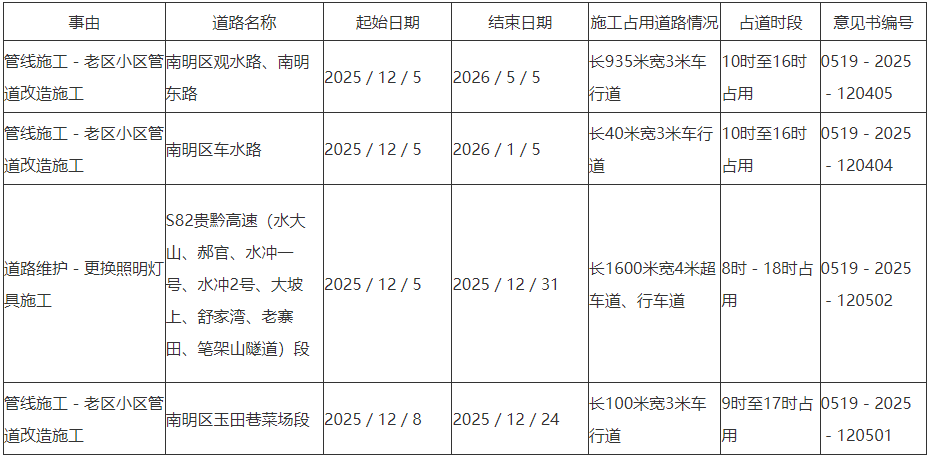 贵阳市南明区观水路、南明东路等近期临时占用道路施工提示