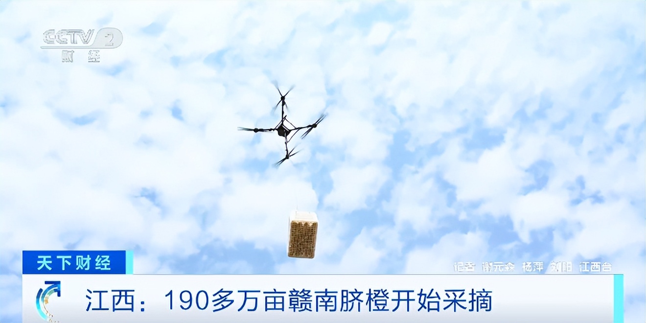 赣州的脐橙树大部分种在山坡上,今年当地利用无人机吊装运输,把脐橙从山上运到山下的时间,从20分钟缩至1分钟,每架无人机日均运量在5吨以上。