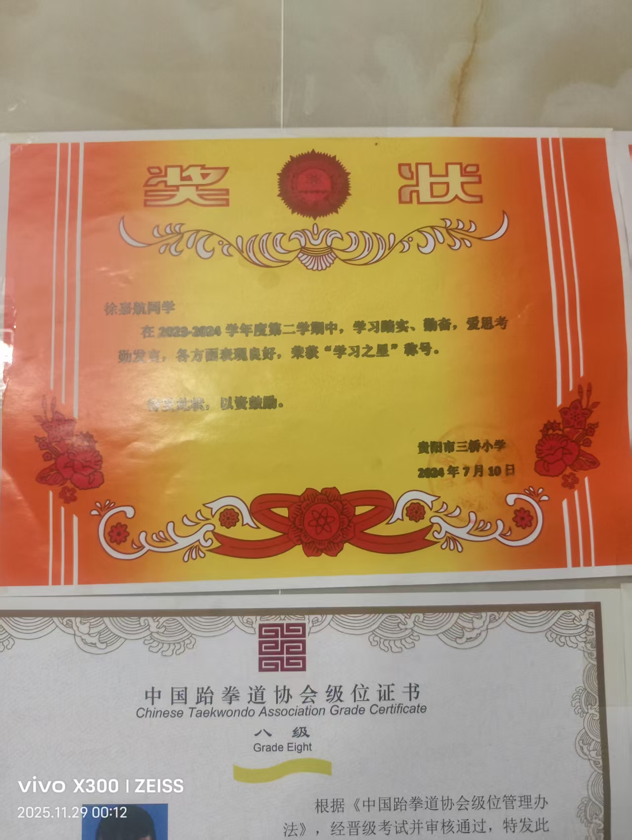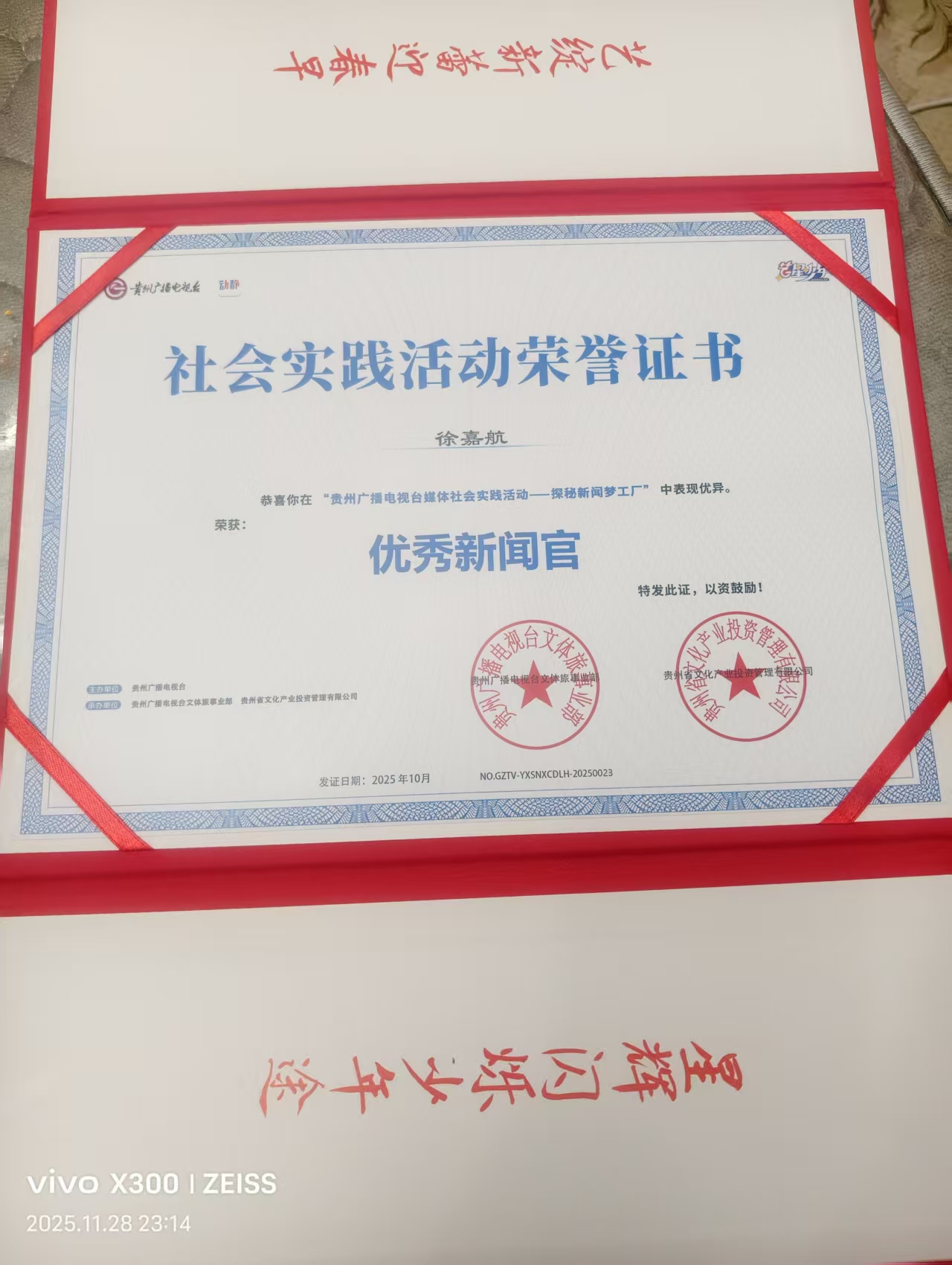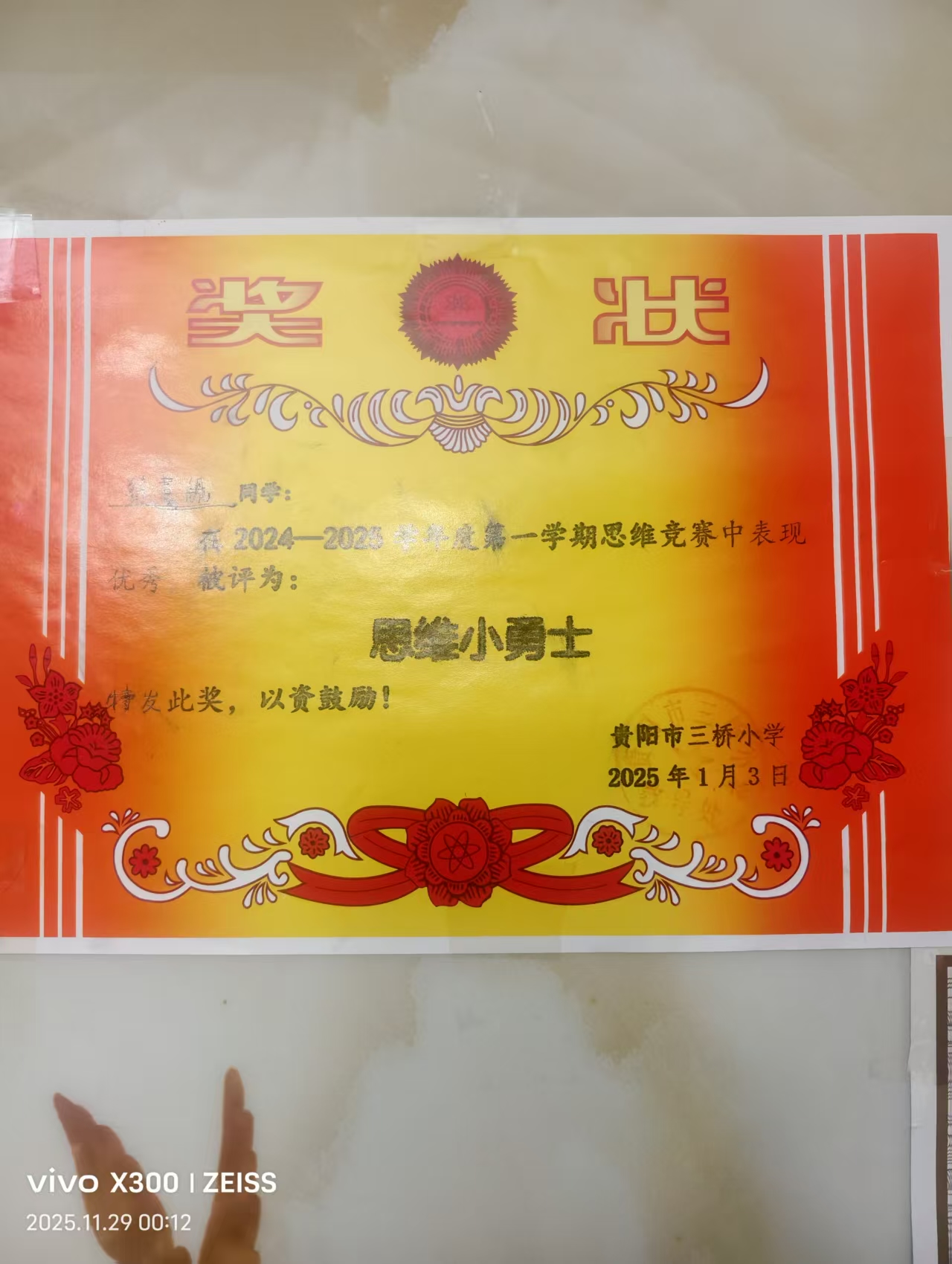 持续的付出换来了丰硕的成果。在2023—2024学年,徐嘉航荣获“数学之星”称号,并连续三年获得“学习之星”荣誉。思维课程上的专注让他在2024—2025学年的思维竞赛中,分别斩获“思维小勇士”和“思维小能手”称号。更值得一提的是,他在贵州广播电视台的实践中被评为“优秀新闻官”,这些荣誉见证着他一步一个脚印的成长历程。