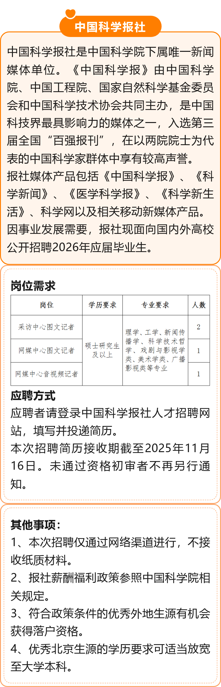 中国科学报社招聘!报名截止时间:2025年11月16日!