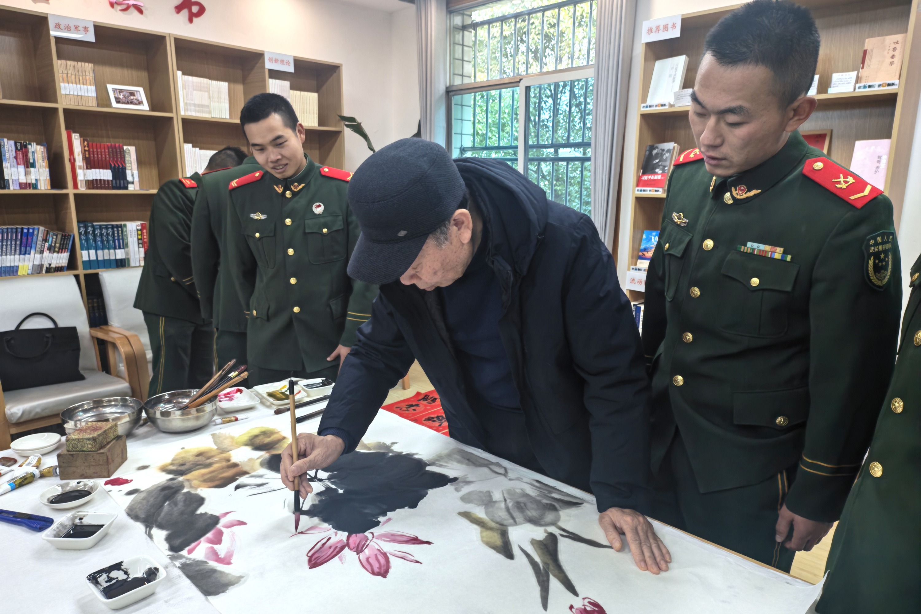 活动现场,暖意融融,墨香四溢。书画老师们铺展红纸、饱蘸浓墨,凝神挥毫。“春到营门万户欢,马驰哨所千山稳”“金戈铁马卫平安,赤胆忠心保家国”……一幅幅主题鲜明、笔力遒劲的春联和一个个寓意吉祥的“福”字跃然纸上,字里行间饱含着对官兵们保家卫国、无私奉献的崇敬之情,也寄托着对新年的美好期许。绘画老师则以象征坚韧的梅花、代表祥和的牡丹等寓意美好的花卉为创作主题,悉心勾勒、细致晕染,寥寥数笔间,朵朵鲜花便生机盎然、形神兼备,为军营增添了浓厚的文化氛围。
