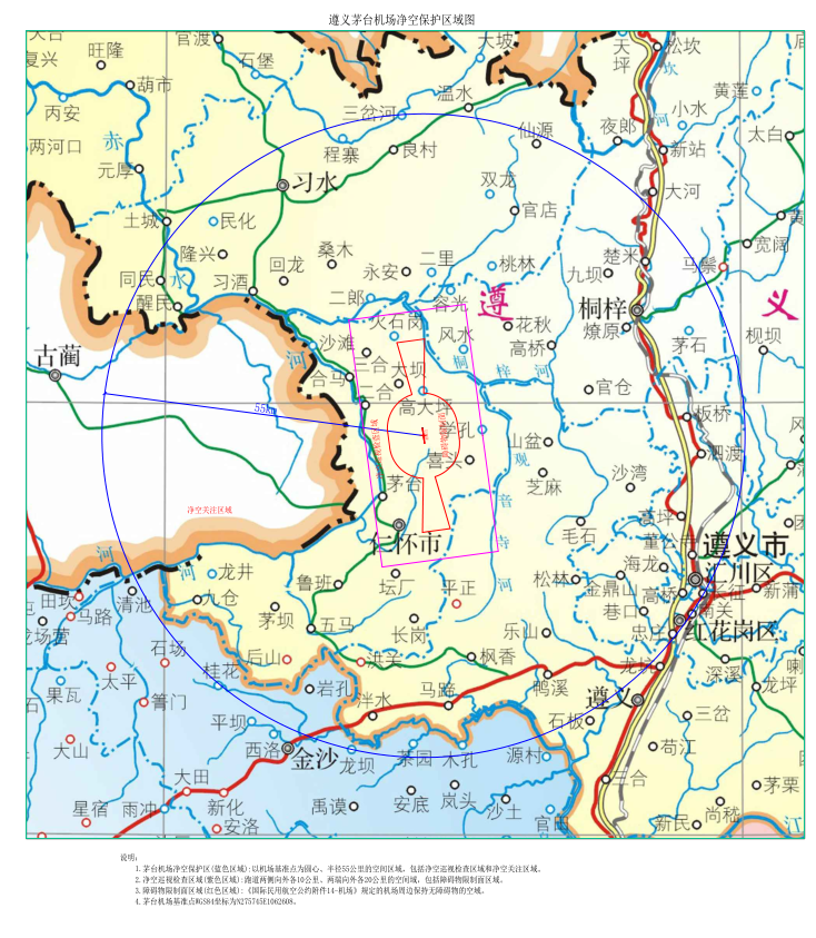茅台机场净空保护区域是指以机场基准点为圆心、水平半径55公里的空间区域,分为净空巡视检查区域和净空关注区域。净空巡视检查区域为机场障碍物限制面区域加上适当的面外区域,一般为机场跑道中心线两侧各10公里、跑道端外20公里以内的区域;净空关注区域为净空巡视检查区域之外的机场净空保护区域。