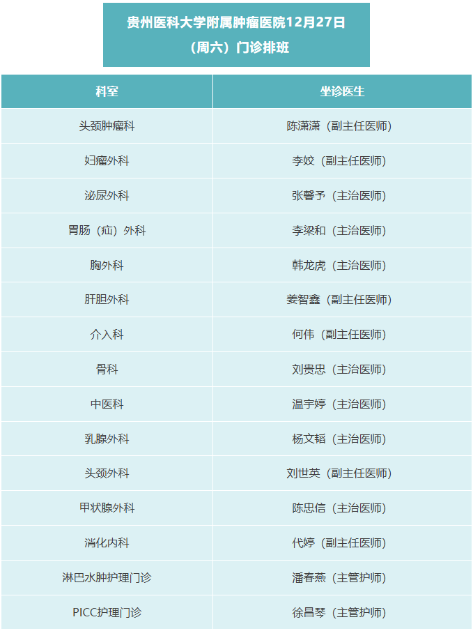 便民资讯 | 贵州医科大学附属肿瘤医院12月27日(周六)门诊排班