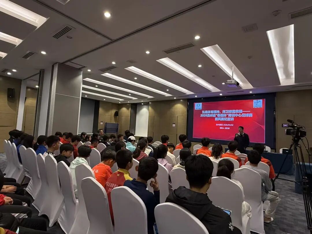 为深入贯彻落实中国足球协会关于青少年足球发展的相关要求,弘扬中华体育精神,筑牢赛事纪律防线,厚植新时代青少年爱国主义情怀,4月2日,2026贵州省“春假杯”青训中心足球赛赛前专题宣讲活动在贵阳顺利举行。本次宣讲以“弘扬体育精神,捍卫绿茵荣耀”为主题,由贵州省足球协会牵头组织,来自全省各地青训中心的教练员、运动员代表全员参会,为即将开赛的赛事筑牢思想根基、划好纪律红线。