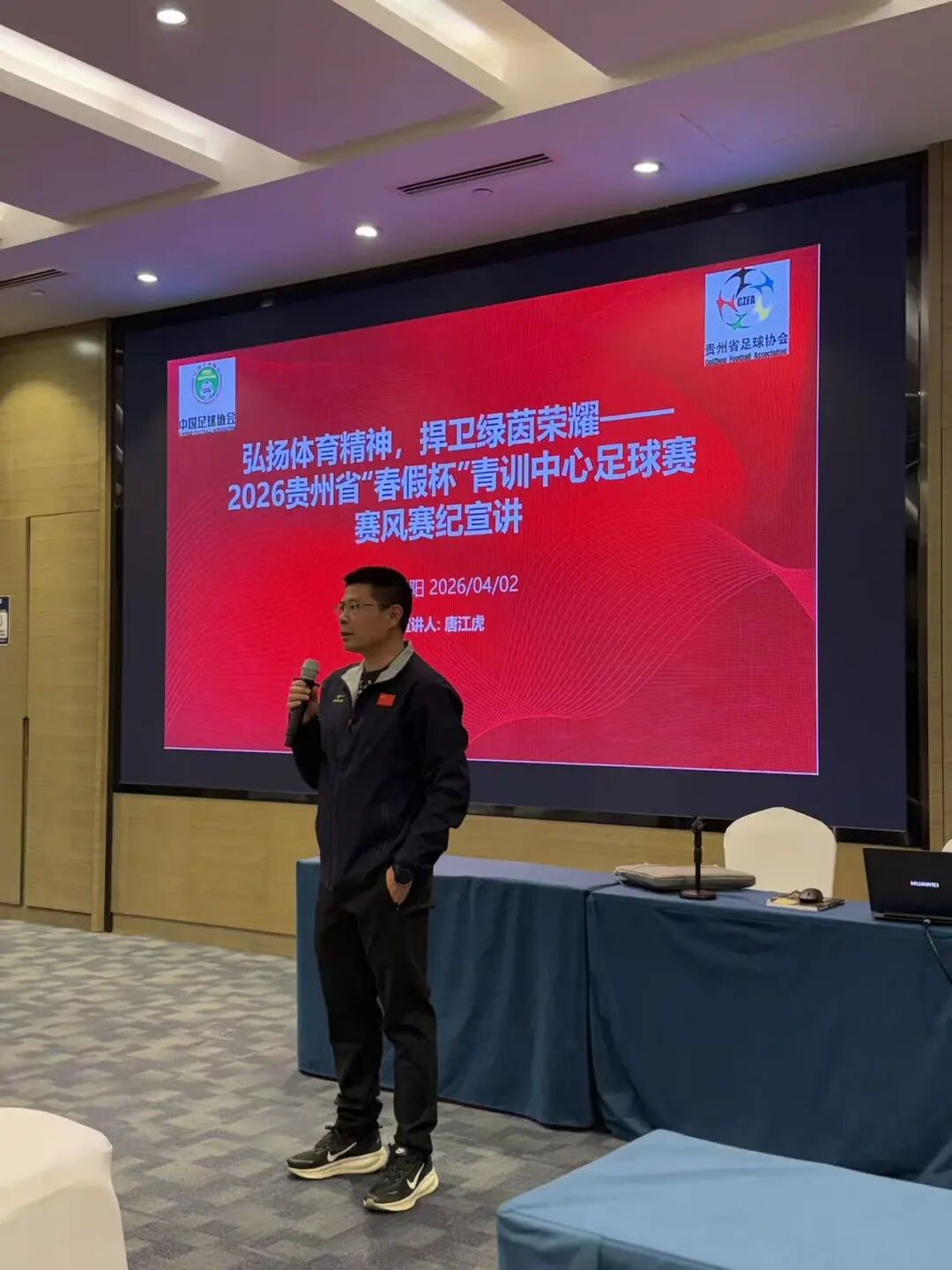 作为贵州省青少年足球青训体系的核心品牌赛事,“春假杯”始终坚持“育人为先、竞技赋能”的办赛理念,将思想政治引领、爱国主义教育贯穿赛事筹备与举办的全流程。本次宣讲由贵州省足球协会纪律委员会主任、中国足球协会职业联赛比赛监督唐江虎主讲,围绕赛风赛纪规范、体育道德建设、爱国主义教育三大核心维度展开,既为赛事明确了纪律“硬标尺”,也为青少年球员注入了精神“原动力”。
