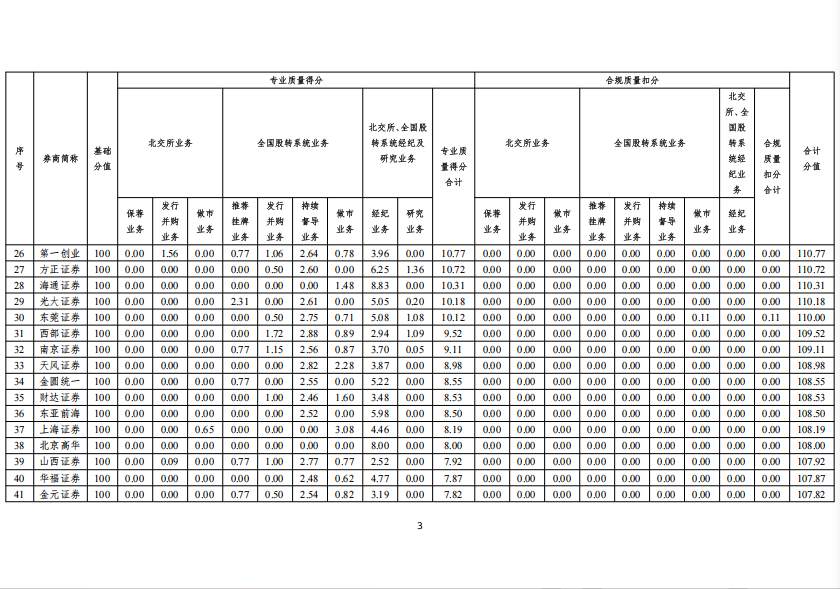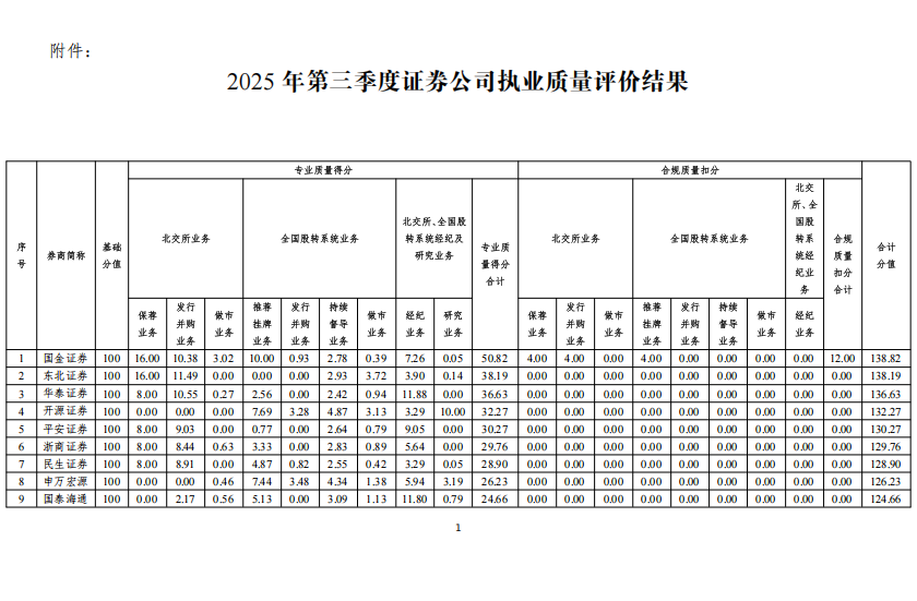 北京证券交易所、全国股转公司根据《北京证券交易所 全国中小企业股份转让系统证券公司执业质量评价细则》,对证券公司2025年第三季度的执业质量情况进行了评价,评价结果(见附件)现予以公告。