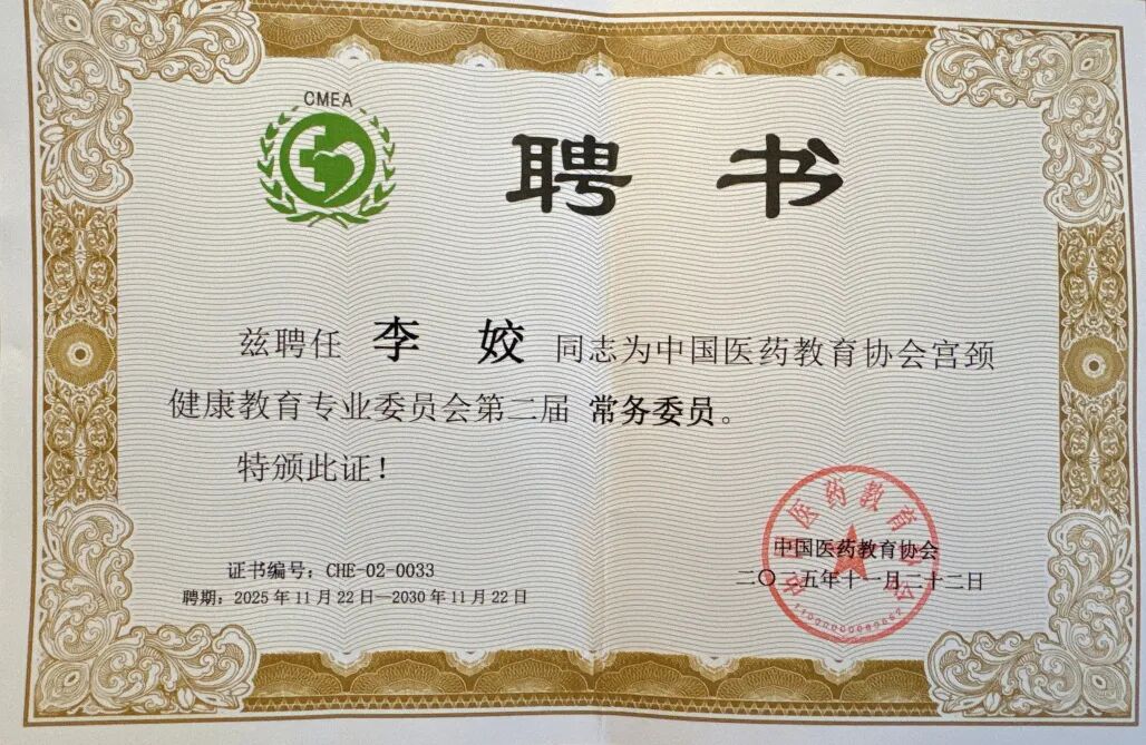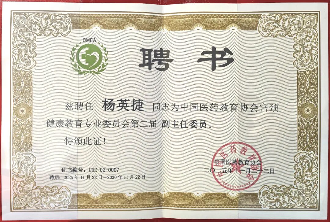 贵州医科大学附属肿瘤医院副院长、妇瘤外科主任杨英捷,在担任第一届中国医药教育协会宫颈健康教育专业委员会常委期间,为促进我国宫颈癌前病变诊疗事业规范化、高质量发展中作出突出贡献,在全面推进宫颈癌消除进程、守护妇女健康付出不懈努力,正式续聘为中国医药教育协会宫颈健康教育专业委员会第二届副主任委员。同时,贵州医科大学附属肿瘤医院妇瘤外科副主任医师李姣也续聘为中国医药教育协会宫颈健康教育专业委员会第二届常务委员。以上殊荣不仅代表中国医药教育协会对杨英捷副院长个人专业能力及团队成员的充分认可,更承载着对每一位获此殊荣的医者的坚定信任。