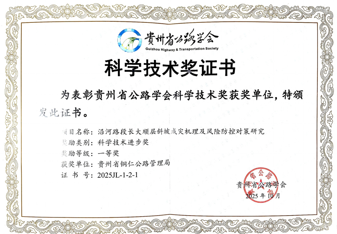 贵州省铜仁公路管理局《沿河路段长大顺层斜坡成灾机理及风险防控对策研究》荣获路基与路面专业组一等奖。