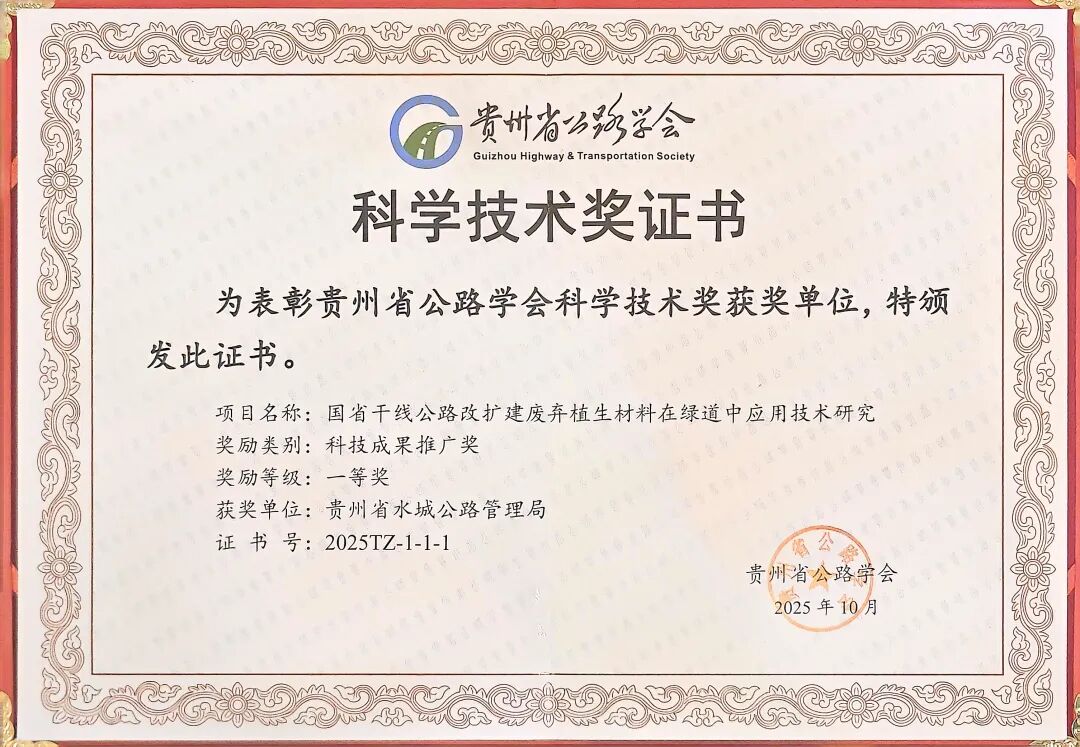 贵州省水城公路管理局《国省干线公路改扩建废弃植生材料在绿道中应用技术研究》荣获科技成果推广奖一等奖。