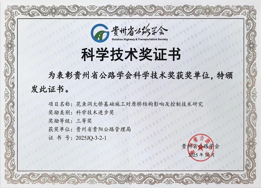 贵州省贵阳公路管理局《花鱼洞大桥基础施工对原桥结构影响及控制技术研究》荣获桥梁与隧道专业组三等奖。