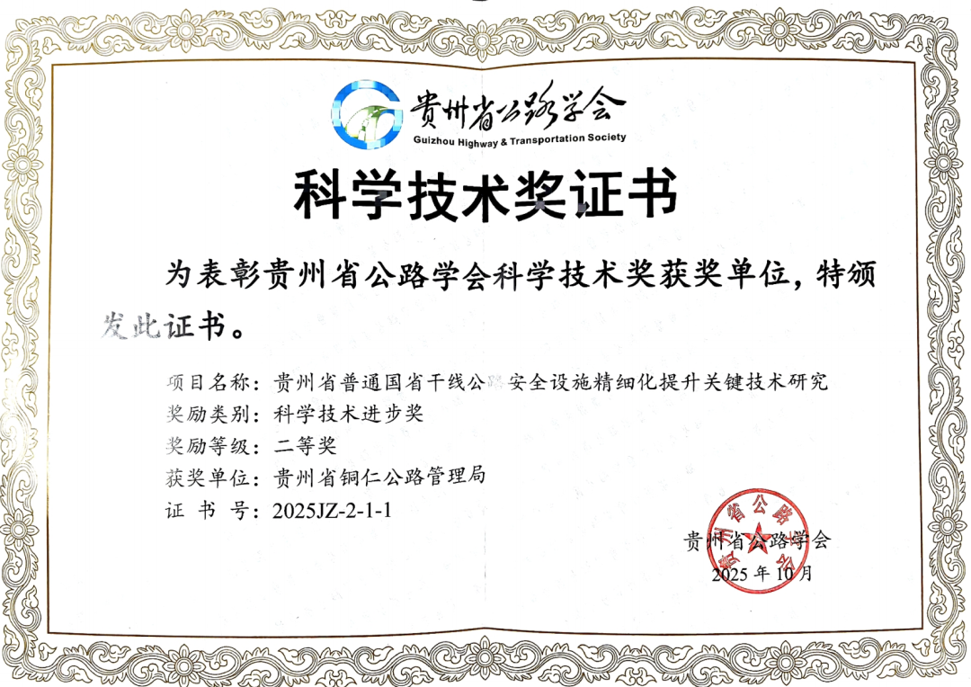 贵州省铜仁公路管理局、贵州省公路局《贵州省普通国省干线公路安全设施精细化提升关键技术研究》荣获综合专业组二等奖。