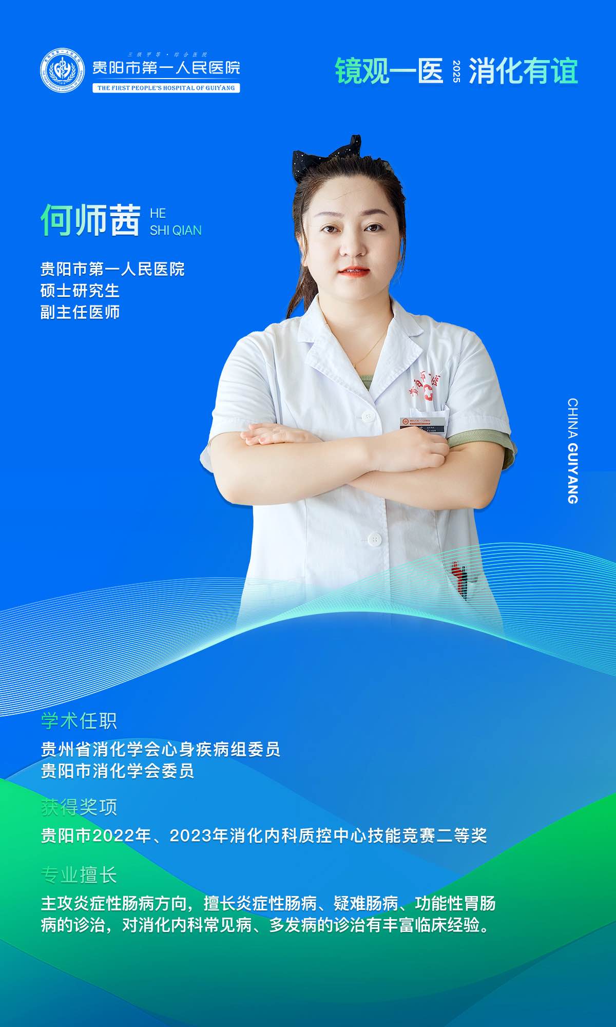 健康从消化开始。“镜”观一医,消化有“谊”,她是贵阳市第一人民医院消化内科副主任医师何师茜,10多年来致力于消化内科临床工作,坚持以病人为中心的原则,着力于为病人解除疾病苦痛,尽全力为病人提供优质诊疗及良好就医体验。健康所系,性命相托,为您的消化健康保驾护航。