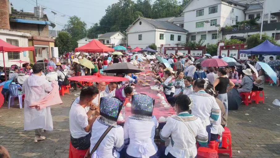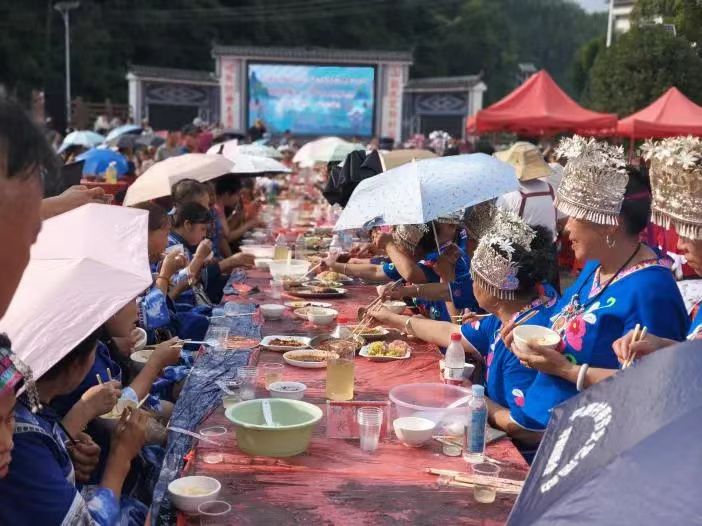长桌宴上,游客们与村民肩并肩而坐,碗筷交错间笑声不断。一碗糟辣鱼,一筷腊肉,皆是心意。语言不通的陌生人,在夹菜劝食中读懂彼此眼神里的温暖。一位老伯拉着游客的手说“来了就是亲眷”,夕阳映照下,心与心的距离悄然消融,共食一席饭,便是一家人。有人说,长桌宴就是毛栗村团结精神的缩影。食物串联起邻里冷暖。不分姓氏、不论远近,一餐饭吃出了共同体的温度与重量。