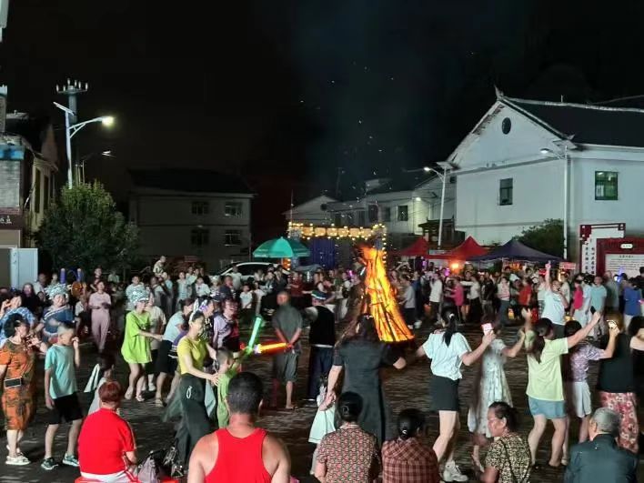 火光跃动,映红了每一张笑脸。男女老少手牵手围成圈,脚步踏着古老的节拍,笑声在夜空中回荡。孩子们模仿着长辈的动作,笨拙却认真,老人们眼里闪着欣慰的光。传统在舞步中苏醒,文化在欢笑里传承,这一刻,毛栗村的心跳整齐而温暖。