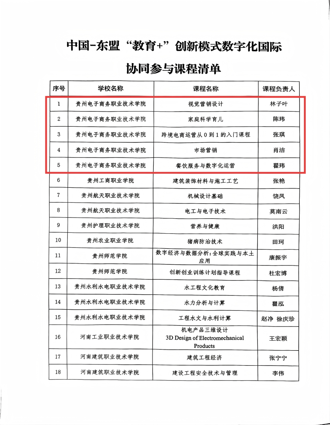 喜报丨贵州电子商务职业技术学院五门课程入选中国-东盟“教育+”创新模式数字化国际课程
