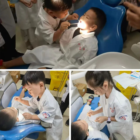 在趣味体验环节中,还特别设置了“伙伴协作”内容。小朋友们两人一组,在医师的指导下扮演“小牙医”,为同伴进行模拟检查。通过角色互换的实践方式,孩子们不仅学习了基础口腔检查的规范流程,更在互动中体会到牙医工作的细致与责任,同时消除了对口腔检查的紧张情绪。