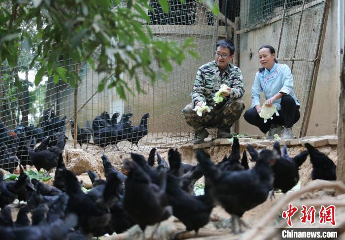 图为李相荣(左)、李淑媛(右)夫妇喂食自家的黑肉鸡。黄兴鸿摄