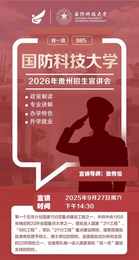 为助力贵州学子圆梦国防科技未来,国防科技大学2026年招生宣讲会即将重磅启幕!现诚邀学子及家长,共赴这场思想与梦想的盛宴: