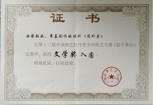 牡丹绽放,曲苑芬芳。6月19日至22日,由中国文学艺术界联合会、中国曲艺家协会、浙江省文学艺术界联合会、杭州市临平区人民政府主办的第十三届中国曲艺牡丹奖全国曲艺大赛(临平赛区)角逐落下帷幕,由贵州省曲艺家协会推荐、贵阳市文联选送谐剧《送外卖》喜获新人奖提名进入终评。