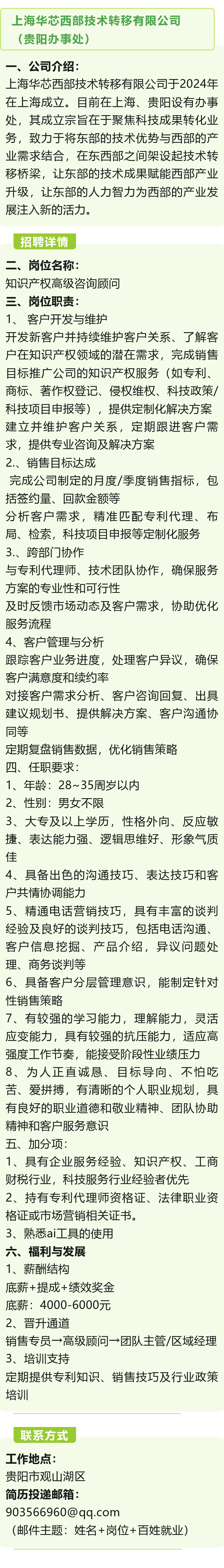 上海华芯西部技术转移有限公司(贵阳办事处)招聘!底薪4000-6000元!