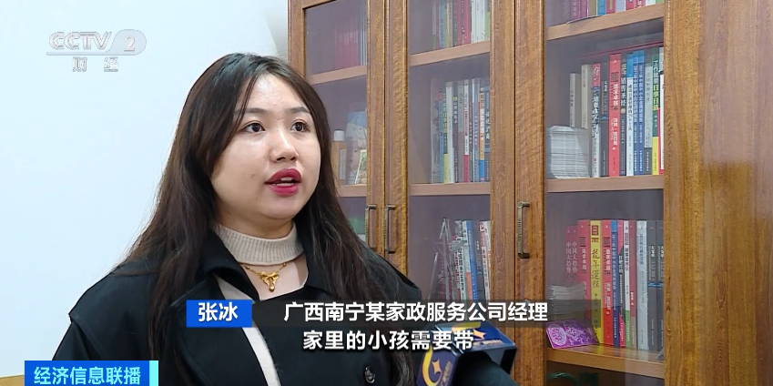 广西南宁某家政服务公司经理 张冰:一是护老员,家里老人需要照顾。二是月嫂保姆,家里的小孩需要带。三是家里的卫生需要打扫。这三个单是最多的。