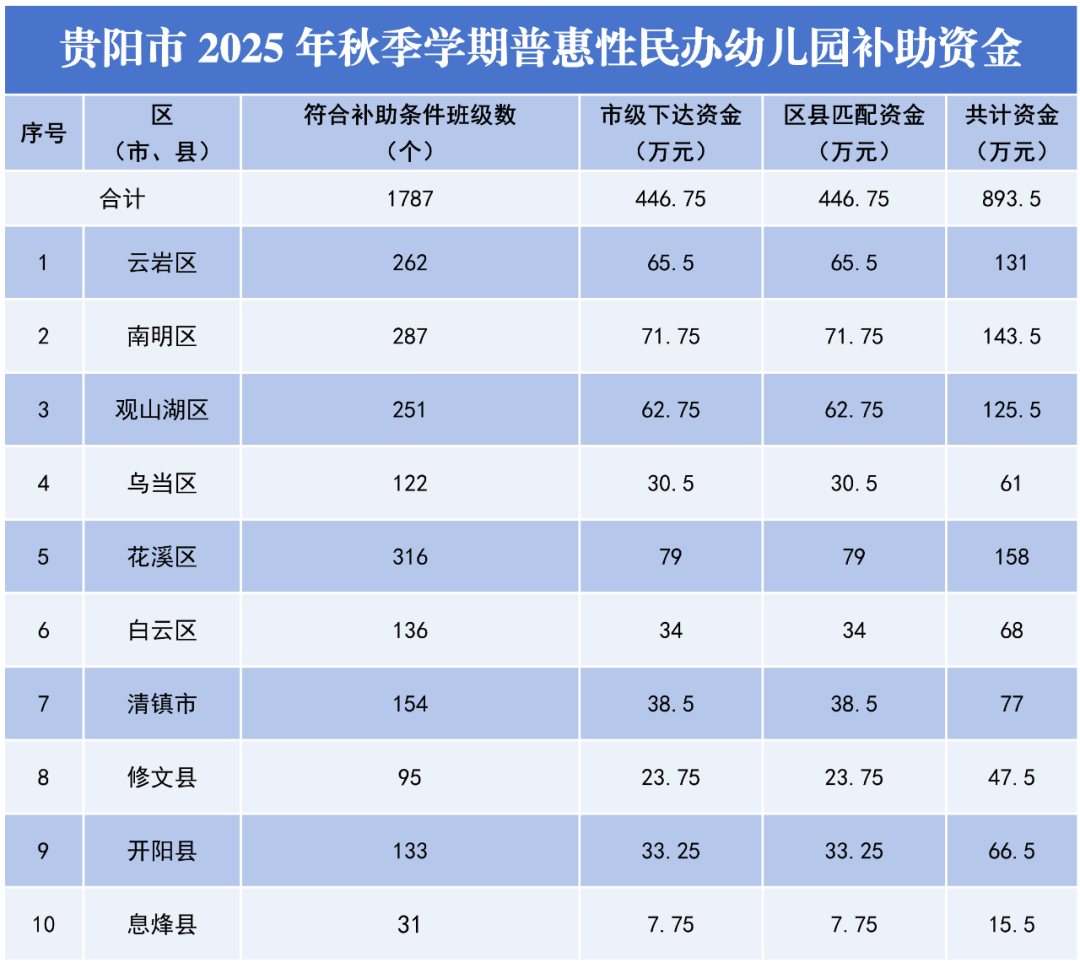 12月1日,贵阳市财政局、贵阳市教育局下达2025年秋季普惠性民办幼儿园补助资金446.75万元,区(市、县)匹配资金446.75万元。