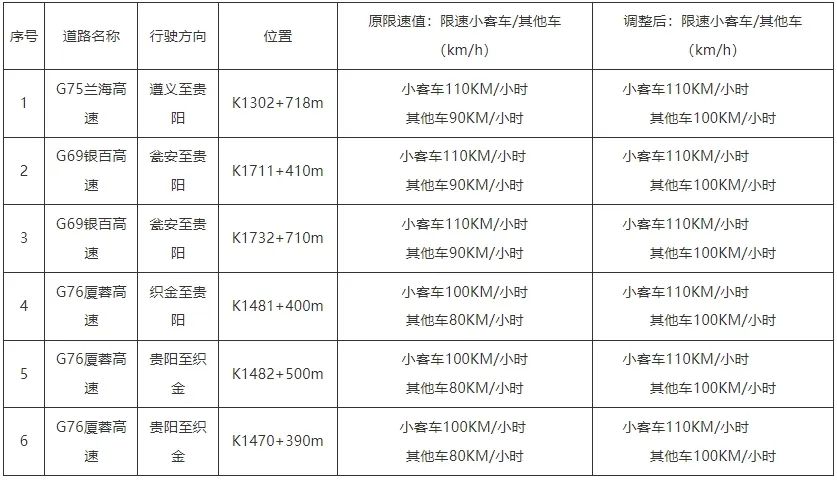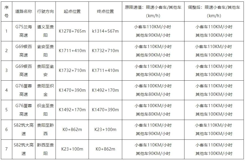 按照省交通运输厅、省公安厅《关于开展全省高速公路限速优化调整相关工作的通知》(黔交〔2024〕3号)要求,贵阳市境内G75兰海高速、G69银百高速、G76厦蓉高速、S82筑大高速已完成速度优化调整工作。为规范贵阳市境内高速公路通行秩序,有效预防和减少道路交通事故发生,贵阳市公安交通管理局决定同步对以上四条高速公路的7套区间测速设备及6套固定测速设备限速值进行调整,现向社会公告如下: