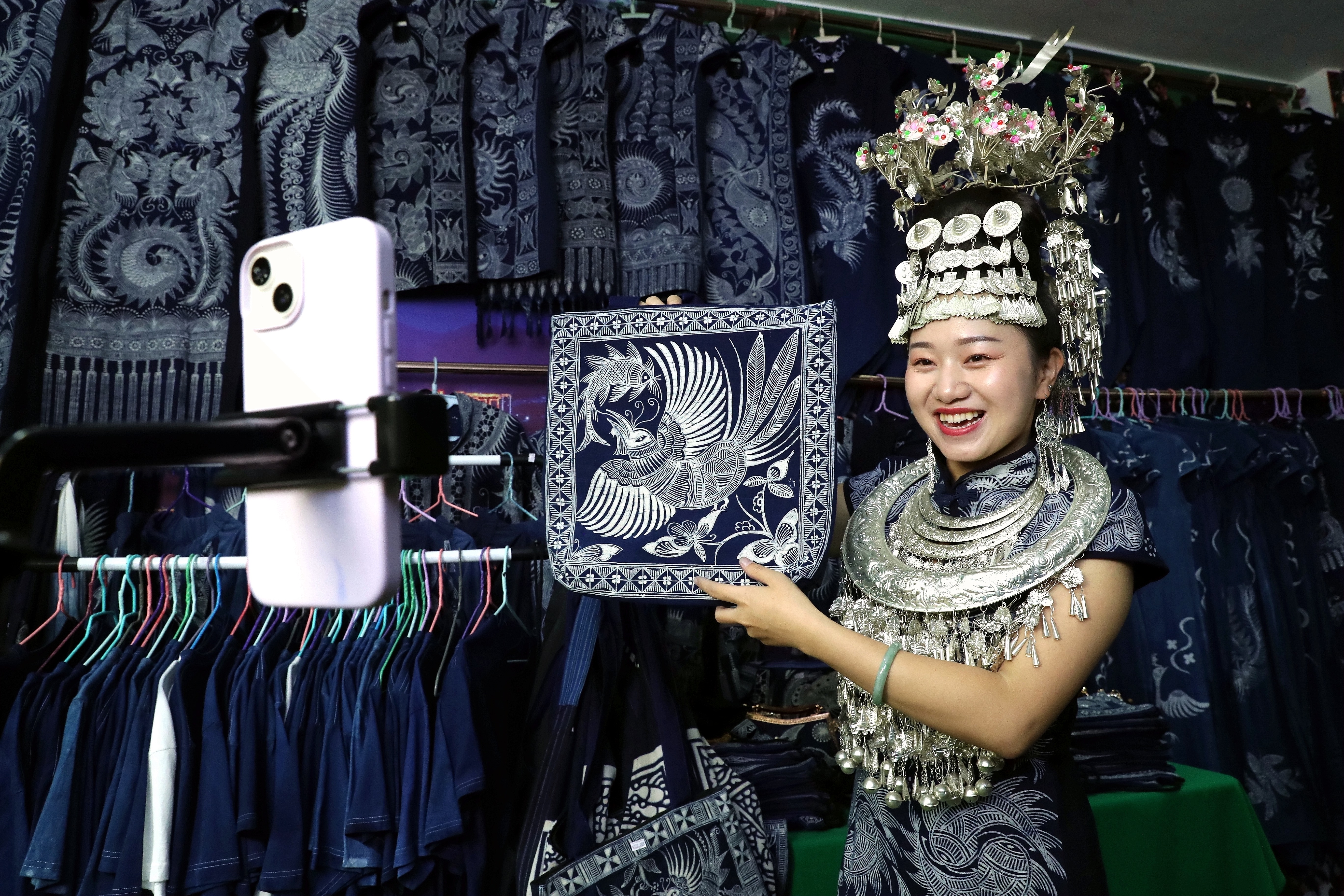如今店铺变成了150平方米的新展厅,旁边还多了专门的染坊。跟着她一起干的绣娘,从最初村里的十几位,扩展到全县两百多人。刘勤兰说,现在算是淡季,游客没夏天那么多,但线上店铺依然能接到订单。她每天照旧更新视频,为开春的旺季做铺垫。“蜡染衣服这时候买得少些,但围巾、小包这些伴手礼,还是不断有人要。”