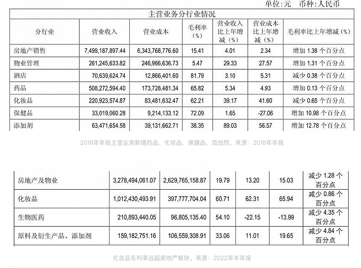 相比之下,前三季度生物医药板块实现收入19.98 亿元,同比增长27.67%;化妆品业务实现收入14.29亿元,同比增长43.91%,其中“颐莲”品牌实现收入5.40亿元,“瑷尔博士”品牌实现收入7.45亿元。值得一提的是,前三季度化妆品板块的毛利率高达58.56%,远超房地产及物业板块的19.79%(参考半年报数据)。