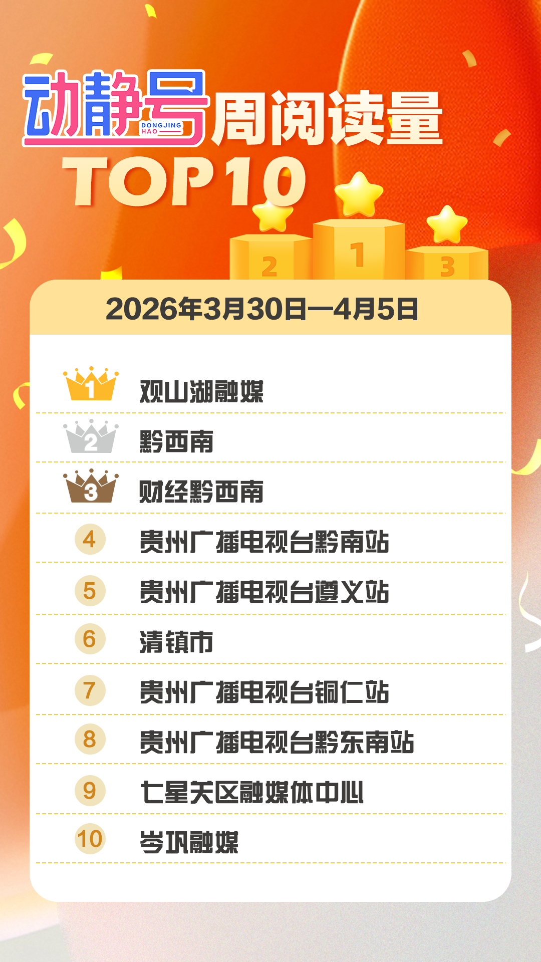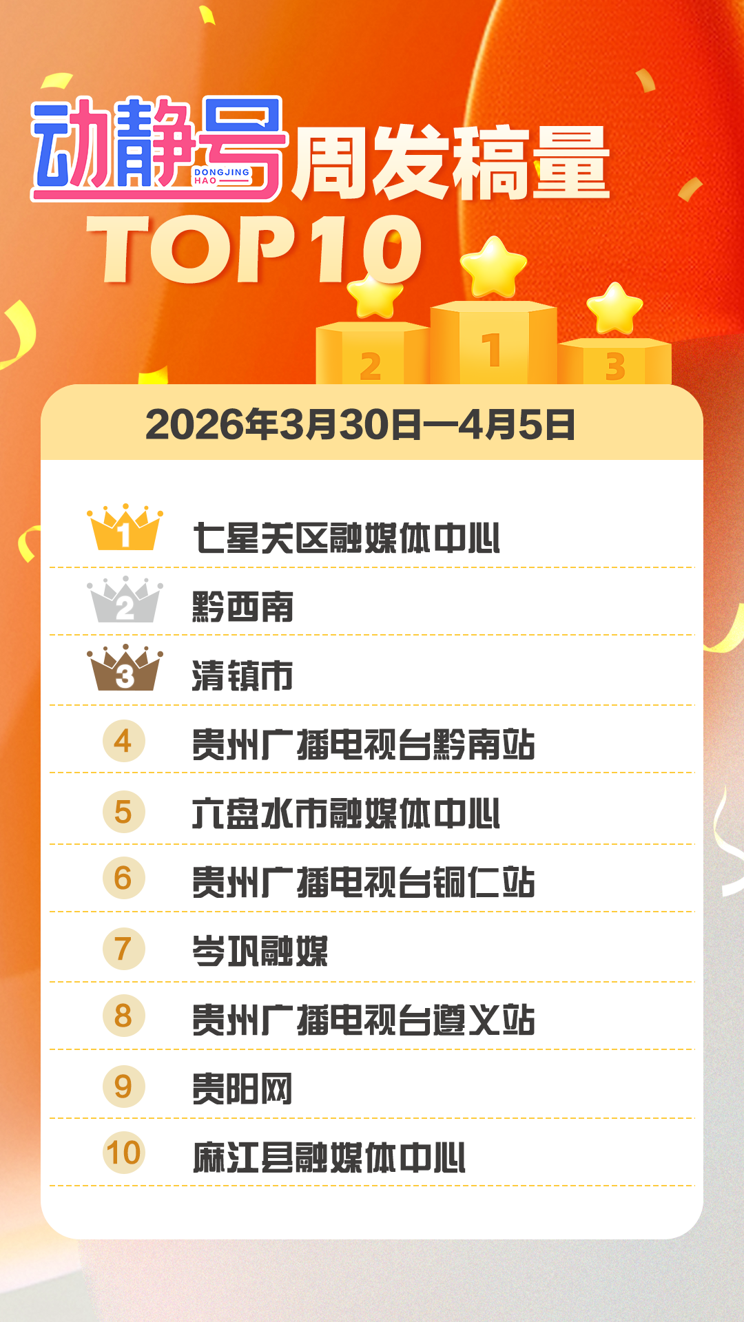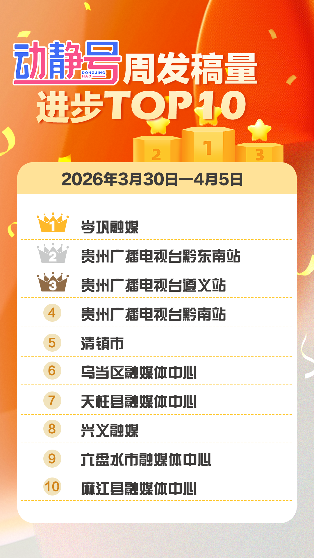 发稿量方面,岑巩融媒、贵州广播电视台黔东南站、贵州广播电视台遵义站环比上周增幅均突破30%,展现出源源不断的创作活力。