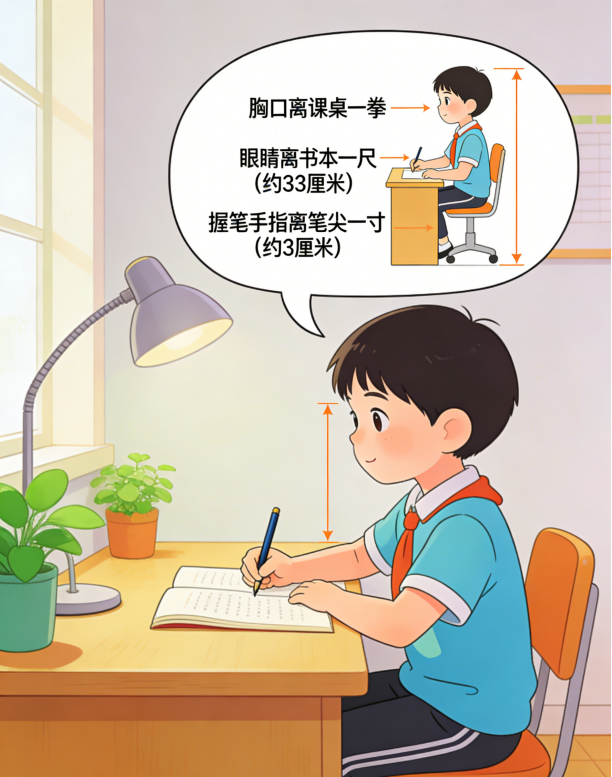 不仅如此,孩子假期需完成各类作业,长时间伏案书写同样是视力健康的“隐形杀手”,家长务必督促孩子保持“一拳一尺一寸”的正确坐姿:胸口与书桌保持一拳距离,眼睛与书本保持一尺(约 33 厘米)距离,握笔手指与笔尖保持一寸(约 3 厘米)距离。