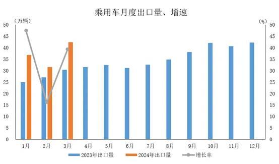 2024年3月,乘用车出口42.4万辆,环比增长34.6%,同比增长39.3%。