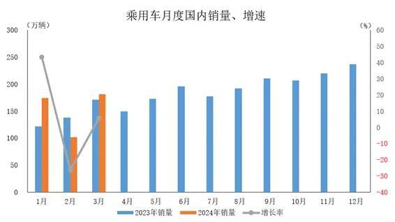 2024年3月,乘用车国内销量181.2万辆,环比增长78.1%,同比增长5.8%。