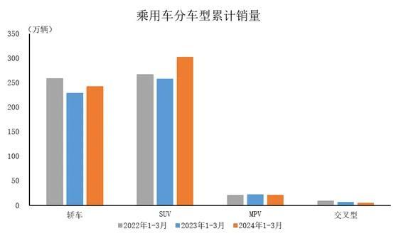 2024年1-3月,在乘用车主要品种中,与上年同期相比,运动型多用途乘用车(SUV)产销呈两位数增长,基本型乘用车(轿车)产销小幅增长,多功能乘用车(MPV)和交叉型乘用车产销呈不同程度下降。