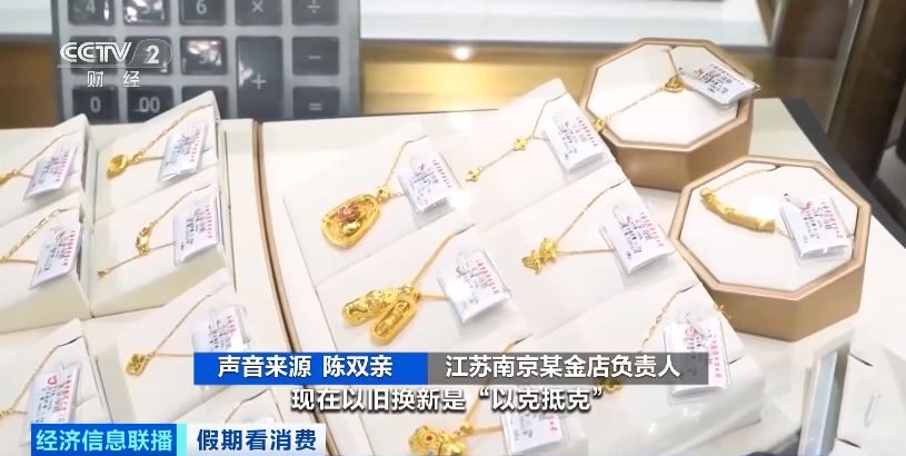 江苏南京某金店负责人 陈双亲:现在以旧换新是“以克抵克” ,付一定的加工费就可以把新的产品带回去。近期,金价的下浮以及节日的气氛,所以客流都挺大的,销售额也同步增长。