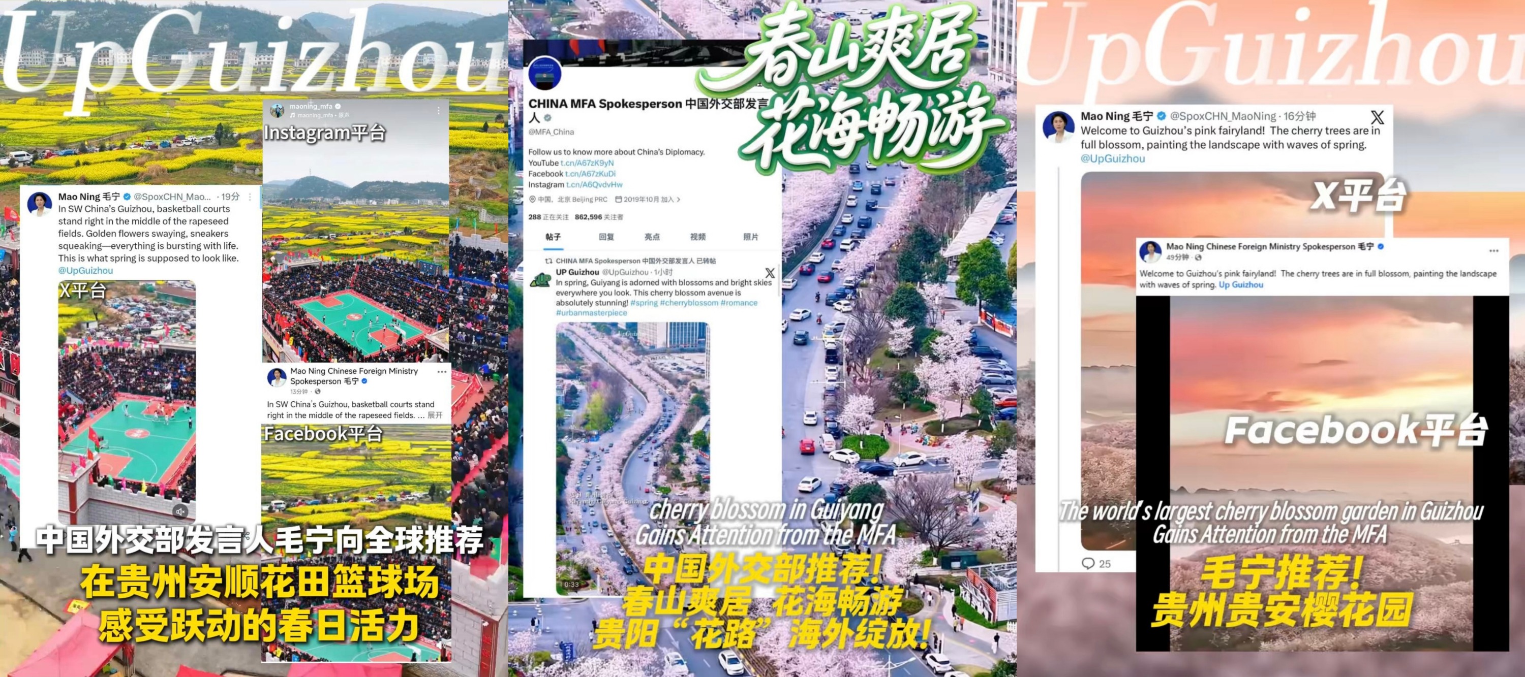 近日,中国外交部发言人官方账号三次在海外社交平台转发帖文推荐贵州春日美景。贵安樱花园的粉色浪漫、安顺油菜花篮球场的跃动活力、贵阳樱花大道的城市花廊,陆续“刷屏”海外,让世界目光再次聚焦这片多彩土地。