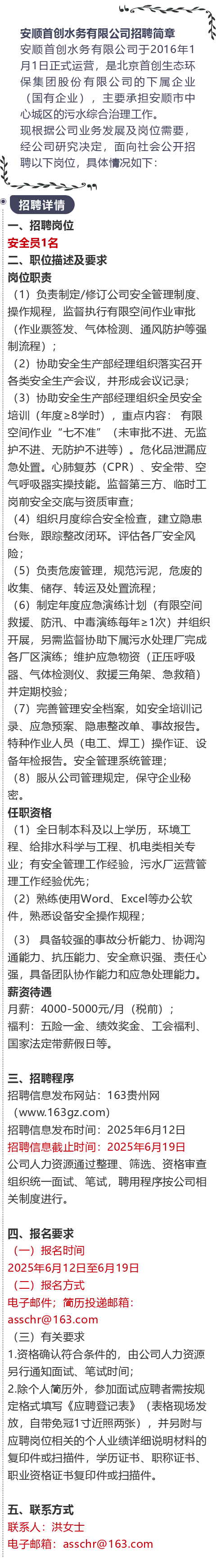 【国企】安顺首创水务有限公司招聘安全员!报名截止时间:6月19日!