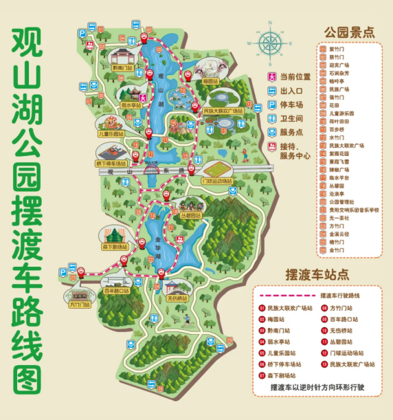 不想走路怎么办?还可以搭乘观山湖公园环湖摆渡车,票价仅需2元/人/次,轻松将公园精华美景“一网打尽”!