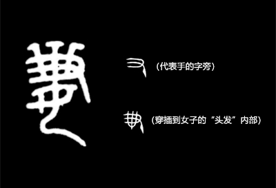 从文字层面看,这一时期的金文(图2)字形结构也发生了变化,代表手的字旁穿插到了女子的“头发”内部,而且有的在“发梢”也做了一定的装饰(图3)。